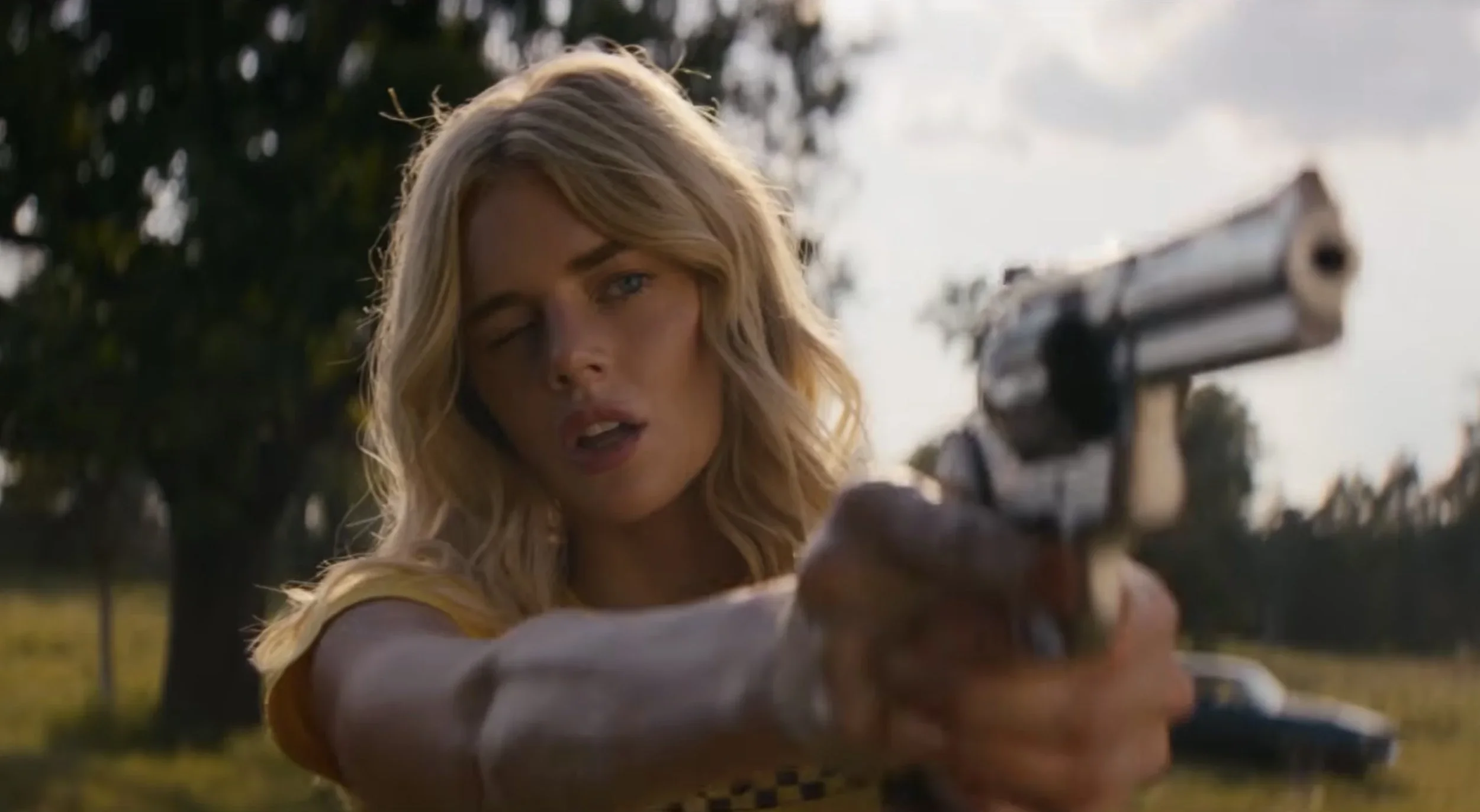 The film follows Caroline (Samara Weaving), a young woman living in Texas with her father (Jon Gries), who yearns to escape her small-town life and find her estranged mother (Kyra Sedgwick). While working a shift stocking shelves at a local gas station, she crosses paths with Oliver (Kyle Gallner), a drifter who cons a cashier out of money in a scheme reminiscent of Peter Bogdanovich’s Paper Moon (1973). Drawn to Oliver’s charm and unpredictability, Caroline is pulled into his world of petty cons as he teaches her the tricks of his trade. When Oliver shows her how to distract someone in order to steal their watch or jewelry, it echoes the 2015 film Focus—a fun coincidence, since people often say Samara Weaving and Margot Robbie resemble each other. Nonetheless, Carolina Caroline succeeds where Focus faltered, thanks to its sizzling chemistry and quaint, small-town country vibe. The absence of cellphones makes it clear the story isn’t set in the present day, though the film avoids pinning itself to a specific year, lending it a subtle, timeless quality.